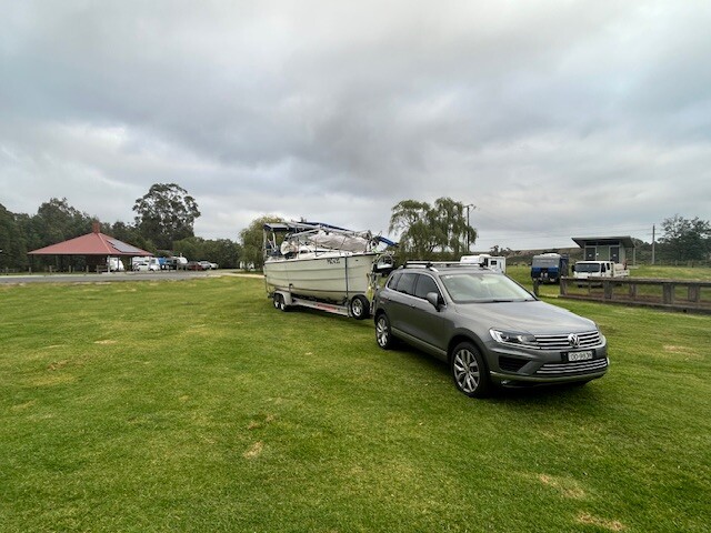 Our strange caravan is an Imexus 28 trailerable yacht!