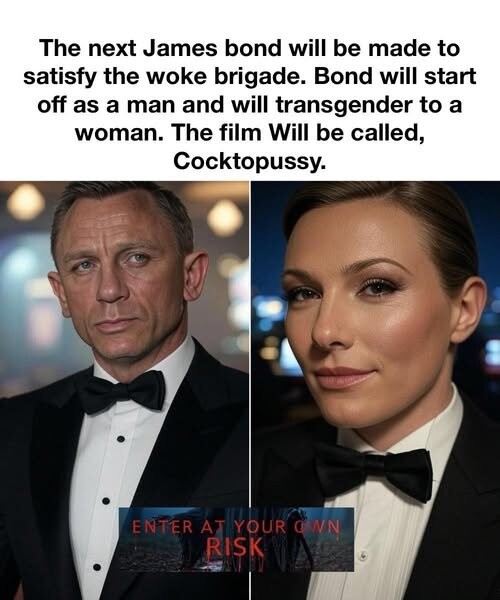 Bond, James Bond... Jamie Bond! Obviously any good spy would get the details right. A dead giveaway that the transformation has failed. Her shirt does not open to the left.