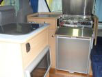 It has one sliding window with flyscreen, can be used for single or double bed, rear lift up end on bed that can be accessed from outside (as well as inside) for easy access to storage, LED reading lights, roof light and bench light. 80ltr Waeco fridge, 12/24V, extra battery, microwave, removable spirit stove (also have a small gas cannister stove if I need it), sink/water tank and electric pump etc.