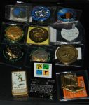 a small collection of some of my geocoins, the one on the bottom left is a GPS and has batteries as it lights up, the one next to it is a laptop, all are not activated, and are not for sale.