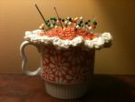 The most popular things are the cup-of-needles. I get the old mugs/cups from charity shops, fill with polyester stuffing, top with a chocheted circle sealed with hot glue. easy..... doesn't even have to be crocheted as felt would work as well.