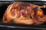 I didn't stab the bird with the rosemary bits, and used bacon instead of pancetta. I covered the turkey with bacon rashers, and when I took it from the oven to rest, I squeezed the juice from the cooked orange all over it.