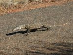 A goanna taking advantage of his camouflage against the road.