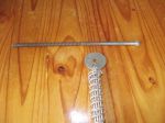 The screw is a 30cm (12-inch) long one bought from America on Flea Bay about two years ago. The washer is 50mm outside diameter with a 10mm hole. A 4mm hole is drilled in the edge and the middle loop in the spring is slid out, the washer threaded onto it then the loop is slid back through the spring.