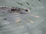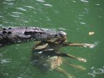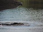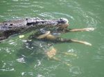 Some photos of five different sal****er crocodiles on 2kms of the lower reaches of the Mulgrave River in Nth Qld (River is Freswater here but not far from Brackish/Salt). As long as people heed the signs erected there should not be any incidents, but there have been some seen close or in these waters.!!. The photos were taken at 9:30am on Friday 16/08/2013, we did not realize what was to unfold as the croc was stirring slightly, then aggressively and the body of a wild pig floated up beside him. The photos of the pig hanging from his jaws were taken from a 100 ft high bank as he slowly floated down river.