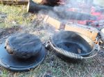 The cheapest item and the most useful is the cut down gas bottle, the chuffer, but only because Rod spent a day grinding and drilling and all I supplied was the bottle, hinge and bolt. 2 quart camp oven 30" cast iron frying pan chain saw 12" long handle axe safety gloves billy can jaffle iron tongs and non stick egg rings. There is another item needed but it will have to wait until I get to a bigger town than Babinda, a tripod to be used above the chuffer to hang the billy into it and when using an open fire it will be useful for cooking above the coals.