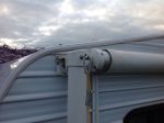 The awning is secured at each end by the storm flaps, and the legs are pegged into the ground, and ropes are tying down each end over the end cross bars. I have straight beams under the awning from the van to the roller and another one lying over the top of those because the annexe doesn't have much fall. I've had to assist run-off as I found in 2008 that an awning without much fall can hold about 500litres of water before the roller starts to bow.