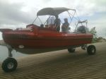 Bill, that (Boat) is called Sealegs, and is a NZ invention. They have been trying to break into the international market for a few yrs. It has a Honda motor under the seats to power the hydraulic motors at the rear wheels. When in water the wheels fold up out of water.