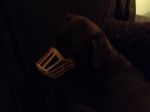 Here we go. Can't find pics from archives, so trust me that the pic is the choc coloured dog, on a choc coloured couch! But u will see the muzzle, and they are the only ones that stop a dog picking up poison bait and allow them to drink. She hates it, but she's alive ;)