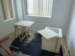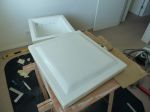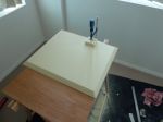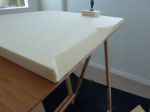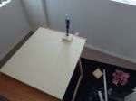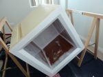 Top lid started. Due to storage reasons the sheets were bent like bananas. Had to work with dirty tricks again to keep them straight while the epoxy glue in between is curing.