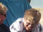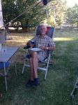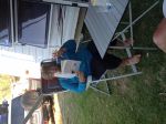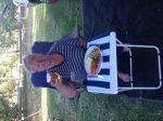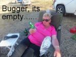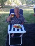 Now the third photo is of a lady, holding the grass nicely, preparing to enjoy 4 vegies and meat at the her dinner table. That's a camp dinner. Winner.