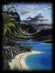 "Let's row over to my place," she says "and I'll give you a tour." So, after a short time of rowing, she soon docks the boat at a small hand built wharf. As the man looks to shore, he nearly falls off the boat. Before him is a long stone walk leading to a cabin and tree house.