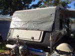 We have a pop top, have a rope track along the front of the top frame; a full length canvas blind that tuckes in behind the gas bottles etc & is held down with 4 ocky straps.