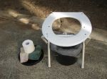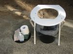 Mine consists of an old X camp seat frame with seat material removed, onto which fits a standard toilet seat with aluiminium channel braces cut so that the frame cannot close when you sit on it...(well that is what it is NOT supposed to do!) The braces are pop-rivetted to the seat for strength, and I trust, certainty of support of even the largest of rears. Underneath goes your recycled for use conveniently with carry handle plastic bucket (Black plastic Ex-Body Builder Protein Powder container) with lid removed. Inside the bucket of course goes the mandatory plastic shopping bag whose purpose would surely have to be very apparent.