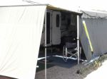 I decided to place a bracket on the side of the van, drill a hole in the caravan awning upright and attach the car awning to it. Yes it is at an angle but check the photos, its a great idea in summer and extends our caravan awning by a meter or two. We got the end piece as well.