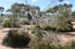 Drove from Norseman to Woorlba Camp 50 km past Balladonia on Tuesday. An attractive camp I stayed at in July. WELL - what a mess. There had been a mini typhoon through the camp on Monday night. Tree uprooted which missed the loo by inches, and branches down everywhere. Not a tree in sight that didnt have some damage or had been uprooted. A motorhome lady and I managed to drag a tree out of the way so we could get to the camping areas. I wondered if anyone was back there during the storm - maybe not as the track out was blocked. Odd thing was it seemed such an isolated hit. Still trees around the emergency phone 100m up the road and only one on the ground over the road.