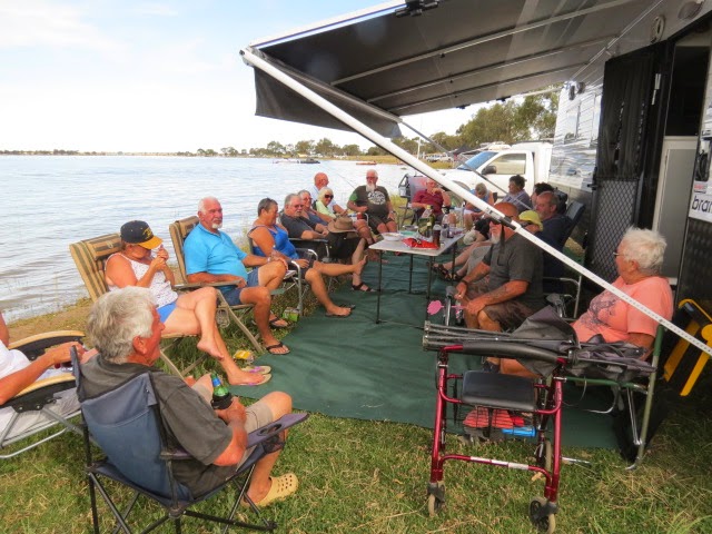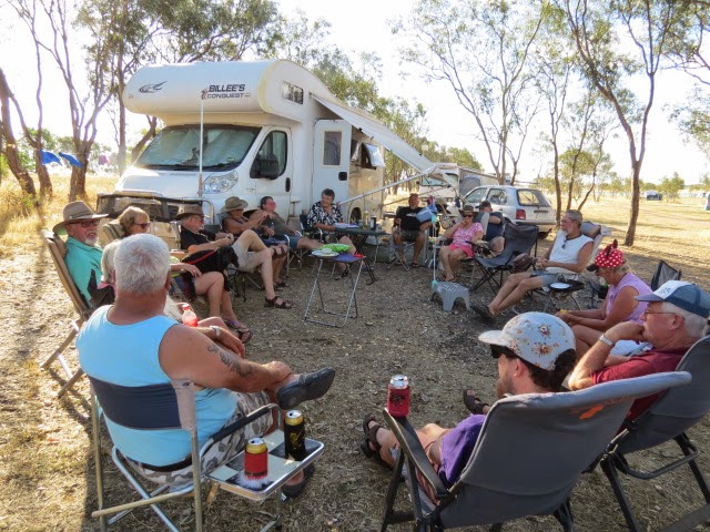 Took the antenna down, no use risking it in the wind that comes suddenly at Greens, the small magnetic antenna works well here whilst parked up in the tree line. Judy left us today having to return home for work duties. Kevin and Kim arrived today, the last time I saw them was in Cairns when Kev checked out my carby and detected the float problem, happy hour at Billeee and Julie's place again well attended.