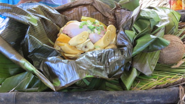 Behind the Big Chief's hut we were treated to a preparation of the "Bougna" an authentic Melanasian meal consisting of chicken or seafood with local vegetables or fruit in this case chicken, banana, potato, sweet potato and pawpaw. It is cooked in banana leaves wrapped entirely then tied with lantana strands into a ball. There is a traditional way of cooking the bougna covered in hot rocks then draped with cloths and covered with earth.