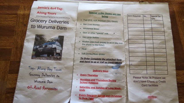 I have got the hang of it now and will use pumpkin next time instead of the chicken carcas brought from the coast, so this afternoon I will go out and bait the nets again. The campers down by the dam were good enough to take photos of my kayaking efforts and they told me about Jamie's Grocery Deliveries to Wuruma Dam, certainly was not here last year and a boon for those of us who have no separate car. John