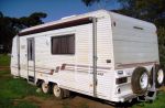 It's a 21 ft 1996 Coromal Caprice with R/V cycle air con, a 150 lt fridge plus a separate Freezer, full oven, plus a Micro Wave, two single beds plus a shower and loo at the rear and a roll out awning & annexe which has recently been renewed, good road tyres on double axles and a couple on new spares on the rear, with a little tiding up we will be on the road for this years Wild Flower Season. " Bring it on"