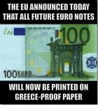 It is a slow day in a little Greek Village. The rain is beating down and the streets are deserted. Times are tough, everybody is in debt, and everybody lives on credit. On this particular day a rich German tourist is driving through the village, stops at the local hotel and lays a 100 note on the desk, telling the hotel owner he wants to inspect the rooms upstairs in order to pick one to spend the night. The owner gives him some keys and, as soon as the visitor has walked upstairs, the hotelier grabs the 100 note and runs next door to pay his debt to the butcher. The butcher takes the 100 note and runs down the street to repay his debt to the pig farmer. The pig farmer takes the 100 note and heads off to pay his bill at the supplier of feed and fuel. The guy at the Farmers' Co-op takes the 100 note and runs to pay his drinks bill at the taverna. The publican slips the money along to the local prostitute drinking at the bar, who has also been facing hard times and has had to offer him "services" on credit. The hooker then rushes to the hotel and pays off her room bill to the hotel owner with the 100 note. The hotel proprietor then places the 100 note back on the counter so the rich traveller will not suspect anything. At that moment the traveller comes down the stairs, picks up the 100 note, states that the rooms are not satisfactory, pockets the money, and leaves town. No one produced anything. No one earned anything. However, the whole village is now out of debt and looking to the future with a lot more optimism. And that, Ladies and Gentlemen, is how the Greeks will pay off their Eurozone debts.