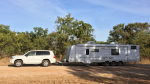 Our caravan is a thirty foot (inside measurement) Spaceland Scenic Vega Family Deluxe. It has two separate bedrooms, shower and toilet, middle kitchen, washing machine and dryer, dishwasher, microwave, two air conditioners, four colour televisions and front club lounge. It tows beautifully - in fact, you'd hardly realise that you're towing anything. We've sold everything, and this is our home, now.