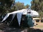 In 2008 we moved on from our Kimberley Kamper Trailer to a Kimberley Karavan. Our first camp in our new home on wheels was at the nice freebie on the bushy common in the NSW town of Broke - mainly because we felt that it reflected our financial status after the big purchase. We certainly enjoy the increased comfort provided indoors by having hot & cold running water, toilet, shower, airconditioning, diesel heating, TV (hardly EVER watch it), diesel cook top and microwave (which we usually store our medication in!). We appreciate the ability to camp anywhere almost indefinitly given the onboard solar panels, generator backup and facility for pumping water into the second tank from any source (although we have managed so far to only use good quality water in both tanks).We also like the option of hooking up the external shower nozzle so we can appreciate our surroundings as we bathe. HOWEVER, our preference is still to spend most of our time outside, under the awning, or tellling tall tales, sipping the odd cold wine/beer beside the camp fire preferably at some pictureseque, remote, awesome part of our beautiful country. When fully laden with fuel, water, gear etc the KK weighs about 1 ton. We towed her in the beginning with our dear old Nissan Patrol, called Betsy, who had given us incredibly faithful service towing our old Kamper all over Australia. After a couple more years, we decided to put Betsy out to pasture, so to speak, and upgraded to our new Nissan Patrol, aka 'Linus' (so named because they were the shares my husband had to sell to pay for her).