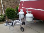 My van, less than 12 months old, has the same amateurish set up for the gas bottles and the regulator is fastened to the ring (that holds the gas bottle.Same as yours except lower.) I would remove the regulators then remove the reg. bracket, shorten it and refix it to the "ring". The top of my regulator is only as high as the top radius of the propane bottle. This arrangement keeps the reg. well out of the way when loading the front boot. You will have to check to see if the hose is long enough to reach the other bottle.