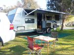 We bought our caravan a year ago when it was just a year old. It is a robust comfortable 25 foot off-road van custom-built by Designer Vans, and whilst we're both a couple of years off retirement we are currently doing plenty of short trips in it, sometimes with the whole family (five of us plus our Aussie terrier "Ruby"), just getting the feel of it and tinkering with its setup getting it ready for multi round Australia trips and gaining experience and confidence getting the rig around and setting up at camp.