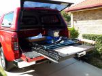 The pull out ute slide was purchased shortly after buying our new ute, the years had caught up to my weary bones and I had serious trouble putting heavy items and then retrieving things from the front of the ute area. Answer one bute ute slide.
