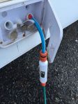 The new (blue) 13 mm filler hose I fitted, connects directly to a 25 mm hose, which I put from the bottom of the original 80 litre tank, to the bottom of the new 59 litre tank I had fitted When I connect the town 13 mm filler hose, with snap on garden fittings, to my new 13 mm filler hose, it is filling both tanks from the bottom, and is not connected to anything inside the motorhome.