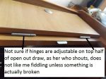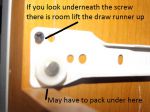 This second picture shows that there is a bit of adjustment on the draw runners After adjusting you may have to pack under the runner, to stop it falling down again This will lift the draw button type lock, closer to the latch Hopefully you will not find that the runner rollers are worn out
