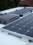 Had some time over the long weekend, and the temperature was lower. Washed the area where the pads were to be stuck down with detergent and then acetone. I used Sikaflex 252 as recommended on their site. $32 bucks a tube, comes in what looks like an aluminum tube, and is quite hard to apply. All went well though and the pads are firmly stuck down on the roof, no screws, no holes. With this style of attaching bracket, the solar panel is removable, which down the track may be handy.
