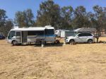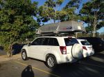 Hi Salt, Hope these photos come through as I've not done this before. I have a Rhino side boat loader attached to my roof rack on my Suzuki Grand Vitara. It weighs 20kgs and the tinny a 3.2m aluminium 55 kgs. I am allowed 80kgs all up stated by Suzuki. I've been flat towing this set up for approx. 12 months now with no worries. . It is a very simple set up with the boat unloaded and loaded by using a common battery operated drill. it takes about 15minutes to load once you get the hang of it. I designed a outboard carrier to fit on my towbar and it carries a 9.8hp mercury. I also strap my redclaw nets inside the boat. cheers and beers Larry. Whoops they turned upside down. Ah well nothings perfect