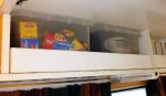 Our overhead cupboards are different. Everything is stored in plastic, translucent (so the contents are visible) boxes. The fronts of the cupboards are short and fold down with spring loaded hinges. The box is easily removed, the item required taken out or replaced and the box replaced. Everything stays where it is put, even under the harshest off road conditions.