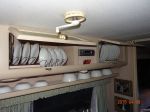 Our overhead cupboards are different. Everything is stored in plastic, translucent (so the contents are visible) boxes. The fronts of the cupboards are short and fold down with spring loaded hinges. The box is easily removed, the item required taken out or replaced and the box replaced. Everything stays where it is put, even under the harshest off road conditions.
