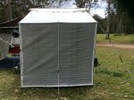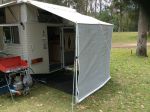 Hi, we have this onour rear door caravan. It was on there when we bought it but i have seen similar ones in one of the Caravan shops here on the Gold Coast. It is attached to the poptop by asliding into a sail track. It has tie down straps fitted and we leave it in permanently. Came with the walls and poles. We use it allthe time. Hope this helps