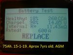 Since its imposible to use a hydrometer as suggested on sealed batterys. I purchased this unit on Ebay for $50, to check state of Health & internal resistance. I keep a record of what the readings are when purchased & fully charged. This then gives me some idea as to how good my batterys are. The 75Ah AGM is quite old & does not have a lot of usable capacity. The 120Ah AGM is only about 6mths old. The tester also can check altenator output & ripple, also cranking test.