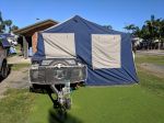 The camper is a "Desert Edge camper trailer" made by Telwater. It is incredibly easy to tow as it is very light and has the Alko tortion suspension system. It comes with an annexe, but we usually used a much larger tarp for multi-night stays. You don't need a "big" 4wd to tow this camper, it weighs 580kg unladen - most campers weigh closer to a tonne. I towed it with a Nissan Pathfinder (R51) and it was barely there. It is a dream to tow on sand! It is ideal for a couple with young kids as is. It has a 9ft tent, but I see you can buy new tents pretty easily these days and could swap it out easily, most of the value is in the chassis. This trailer has lockable storage on the front and sides.
