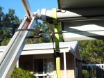 Jon, I think Ian's tie down cords are stronger than bungy cords - but yes, safety has to be considered. It does overcome the problem of having to drill, rivet the awning arms & having them jam.
