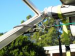This clothesline is simple to make, simple to put up and pull down. The materials you need are two rubber tie-downs, swages, shrink tape, clothesline, heat gun and swaging tool. All available from the green shed. The plastic coating needs to be removed before swaging, 2mm swages, and 200mm rubber straps x 2. Requires no hole drilling in the awning strut. Ours gets used all the time, so I know it works. More info if required.