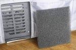 I used a bit of open cell foam for a dust filter. Works well, not blocking too much air but still providing enough interruptions to air flow to block dust (behind your external grill, not next to the fan as in my 28L fridge's situation due to limited space).