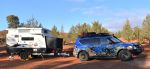 Here is our coral reef rig including a Nissan Patrol Y62 with coral reef wrap and a Golf Savannah Maxxi 390 off-road pop up caravan with fish motif. The caravan includes separate shower and toilet rooms, 2 x fresh water tanks, a grey water tank, 2 x double beds, 2 x solar panels, 2 x 100Ah batteries, a true state of charge battery monitor (ePRO plus), 2000W inverter, indoor and pull-out outdoor kitchens, oversized fridge, AC, wireless levelling sensor, wireless gas level monitors for our 2 gas bottles, and a VAST satellite TV system.
