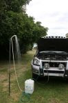We have a pump and heat ex changer mounted behind the Bullbar,just put the hose in plastic drum if not near water.If near a stream or river,throw the hose in and you can have a long hot shower.