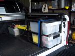 Snap on lid plastic boxes are in my patrol, third row of seats (temporarily) removed, boxes strapped down with 25mm Nylon straps to anchor points (Baby Capsule anchors) - The "load" is covered with an old Military issued woolen blanket which keeps sun and prying eyes away. I purchased a fridge slide to fit when I purchased Patrol. To date I haven't fitted it due to weight but I an now considering putting it in as it is getting increasingly difficult for the child-bride to reach into the Waeco from behind Patrol.