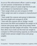 Hi Neil....if you simply are wanting to determine the weight of your van,and that it doesn't exceed your ATM rating,that must be done with the van disconnected,so obviously without any WDH. However,when the van is connected to your car,and you are using a WDH,ALL weight measurements must be done with the WDH tensioned,as if you were set to travel. To do otherwise would give false readings,and false hope to those who suspect that they're overloaded.If your disconnected van exceeds its ATM by "...perhaps 20kg at times...",you can rest assured that once that van is connected to your car,and the WDH tensioned,you will be waaay over your rated ATM.This is because weight has been added to your van's axle group,but towball weight has not changed,so the total weight of the van has increased.The first half of the script you have supplied,from the ex VRs enforcement officer, clearly explains that all weighings of front axle,rear axle and van axles are done with the WDH tensioned.It is only when they are trying to determine the actual van weight that the WDH is untensioned.Cheers