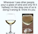 Whenever I see someone fill a wine glass to the brim, my thoughts are one of us has a drinking problem and its not me.