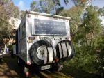With the 4x80W portable panels for my previous MH i strapped them on top of 'gear box' on the back for driving. So I made some plywood spacers to protect them. as they evolved they were rectangular, shorter than the panels and as wide as them. I cut notches, so the panel edges would sit into them when angled on the ground. So had some two height props, medium and steeper, using the ply spacers. That worked OK and was probably enough of a variation IMHO.