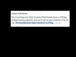 I have just bought a new Pathfinder, and I must say its fantastic, tows great, ticks all my boxes. will be used for towing and non towing duties. I looked under the tow bar the other day and to my surprise the plate thats welded onto the tow bar, just behind the spare wheel has the max tow ball weight at 200kg. Maximum towing is 2700kg. All other imfo from door pillow stickers to hand book and other advertising stuff is listed at being TBW 270kg and 2700kg max towing. It doesn't worry me that much as my Adria van TB weight is 120kg and ATM is 2000kg. But if I wanted to buy another van one day it could affect what I buy. So what label is correct?