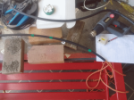 Picture 1 - Bracket and tools to make it. 365 x 80mm, 45° bend at 95mm, narrowed end 50mm with 90° bend at 105mm. YMMV
